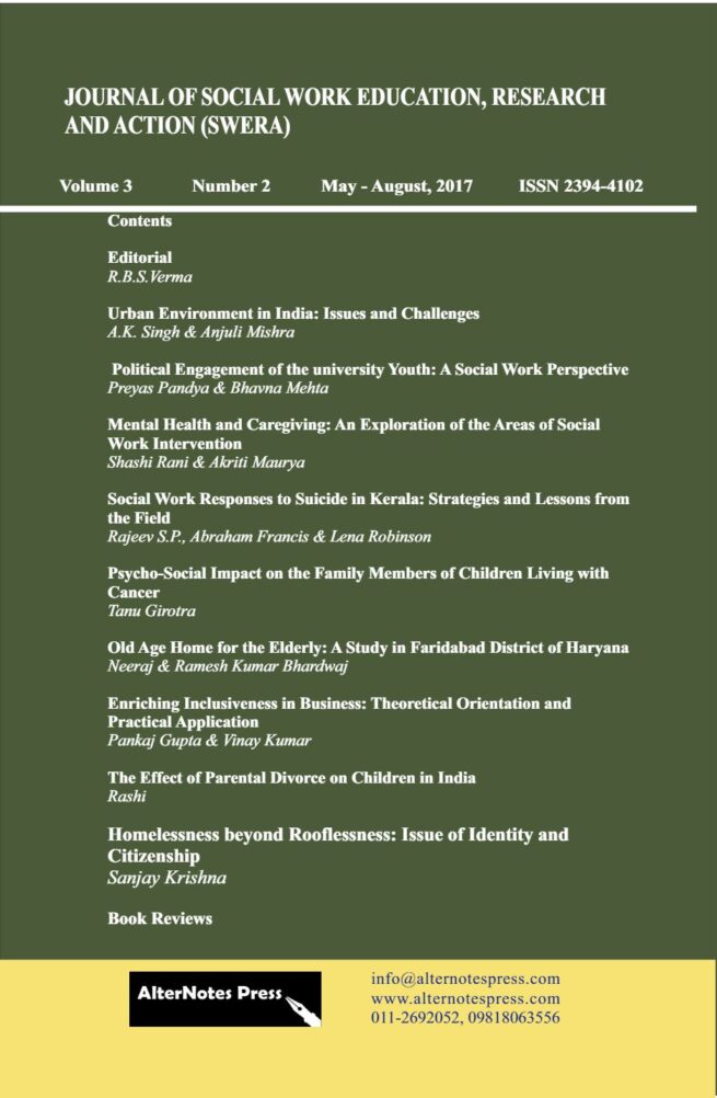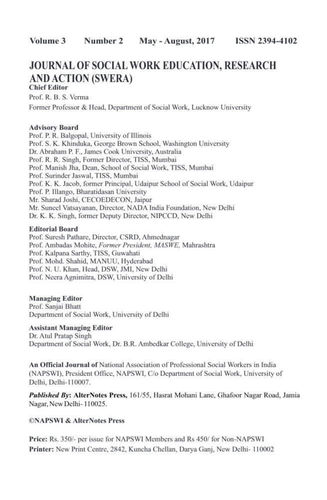 Social Work Education, Research and Action (SWERA)is the official journal of the National Association of Professional Social Workers in India (NAPSWI). It is peers reviewed refereed Quarterly Journal designed to share and disseminate knowledge and promote exchange in the fields of social work, research, and community action programs. SWERA aims at advancing the theory, bridging the gap between theory and practice, and developing the indigenous knowledge for the fraternity. It provides a platform to educators, researchers, practitioners of social work for publishing their innovative ideas in the form of articles, research papers, and book reviews. SWERA is published triannual (thrice in a year).