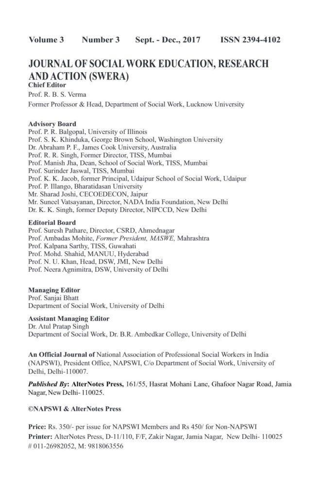 Social Work Education, Research and Action (SWERA)is the official journal of the National Association of Professional Social Workers in India (NAPSWI). It is peers reviewed refereed Quarterly Journal designed to share and disseminate knowledge and promote exchange in the fields of social work, research, and community action programs. SWERA aims at advancing the theory, bridging the gap between theory and practice, and developing the indigenous knowledge for the fraternity. It provides a platform to educators, researchers, practitioners of social work for publishing their innovative ideas in the form of articles, research papers, and book reviews. SWERA is published triannual (thrice in a year).