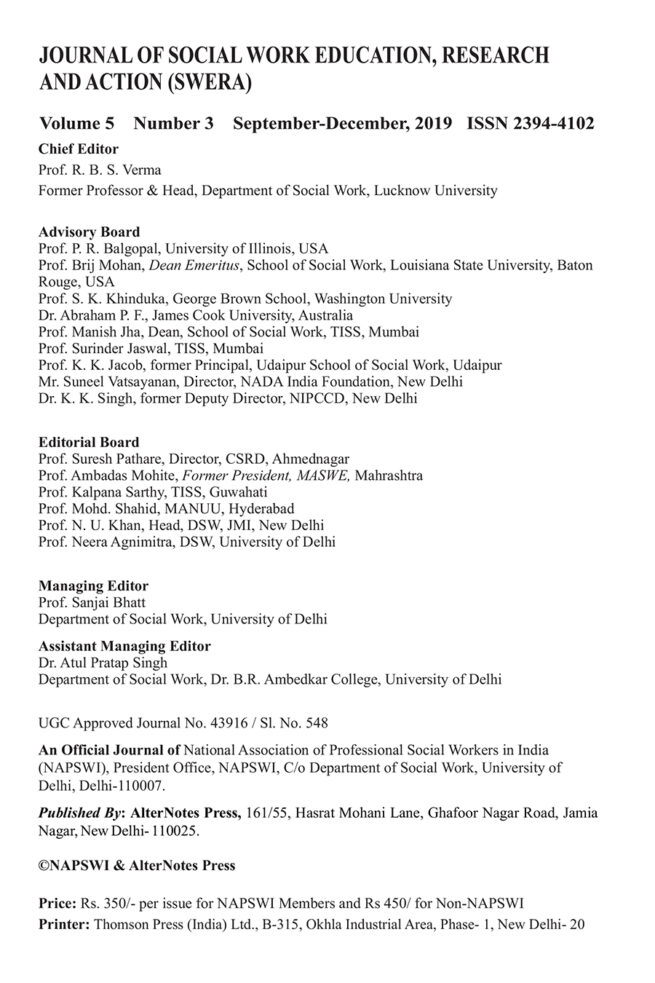 Social Work Education, Research and Action (SWERA)is the official journal of the National Association of Professional Social Workers in India (NAPSWI). It is peers reviewed refereed Quarterly Journal designed to share and disseminate knowledge and promote exchange in the fields of social work, research, and community action programs. SWERA aims at advancing the theory, bridging the gap between theory and practice, and developing the indigenous knowledge for the fraternity. It provides a platform to educators, researchers, practitioners of social work for publishing their innovative ideas in the form of articles, research papers, and book reviews. SWERA is published triannual (thrice in a year).